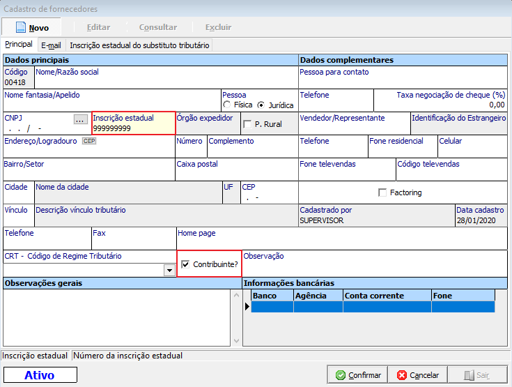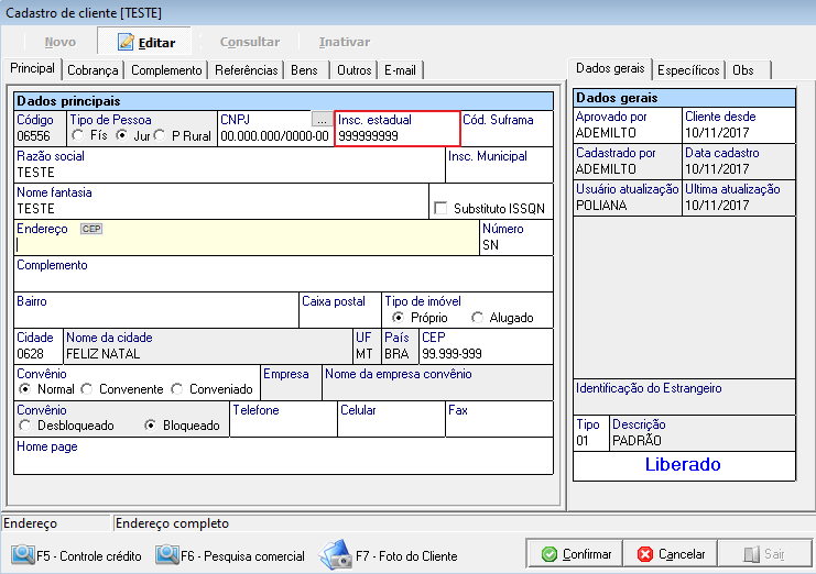 Assim que souber a IE, a mesma deve ser informada no cadastro do cliente no Sistema Eco (REC000CA). Como no exemplo abaixo: