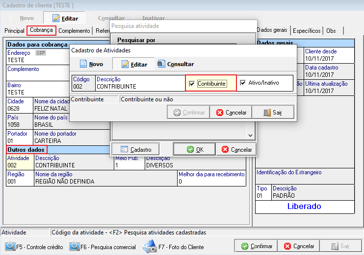 Depois de informar a IE, existe a aba “Cobrança” na mesma tela de cadastro, lá existe outra configuração que deve ser verificada, em “Outros dados”, a Atividade selecionada deve estar configurada como na imagem a seguir: