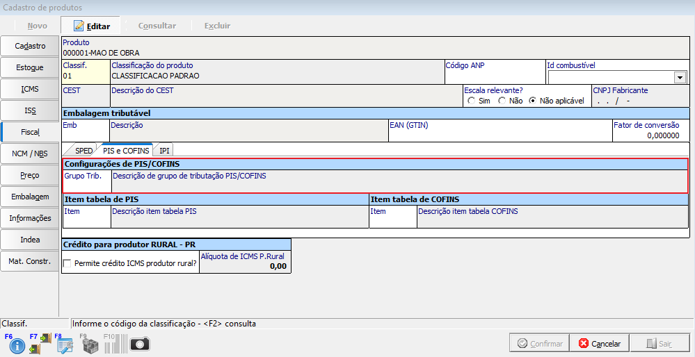- Abra a configuração do grupo de tributação PIS/COFINS (Para abrir, F2 no campo Grupo Trib.> clicar em “Cadastro”).
