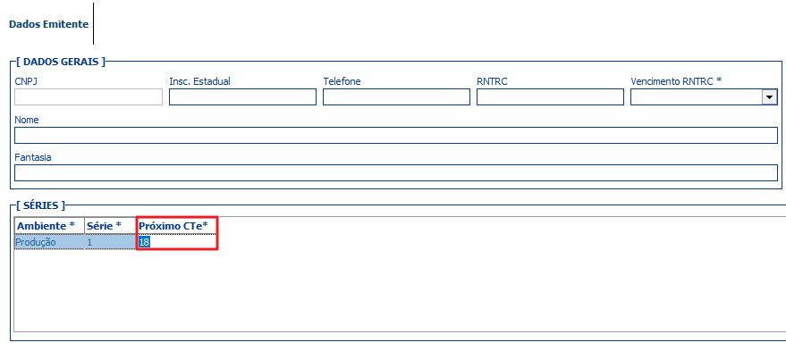 Verificar com a contabilidade a última numeração utilizada na emissão de CT-e, e realizar o ajuste no EmissorCte. No Cadastro do Emitente, no campo “Séries” de acordo com a imagem abaixo: