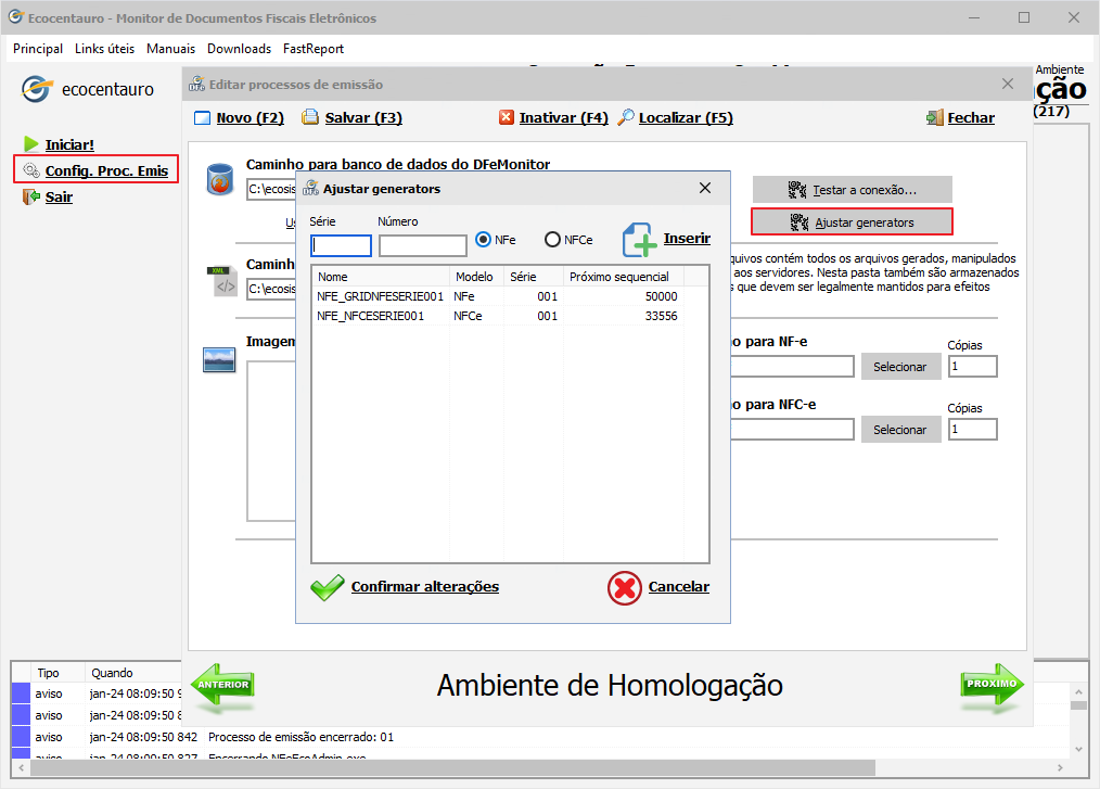 Quando o erro for por conta de duplicidade, primeiro deve ser verificado com a contabilidade a última numeração de nota emitida, para depois fazer o ajuste da mesma nas configurações do processo de emissão (F5) no DFeMonitor, como na imagem:
