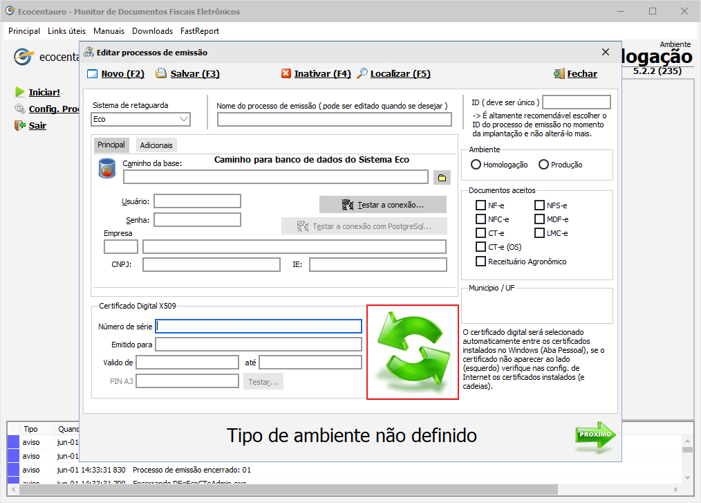 Feito isso, inicie o Processo de Emissão e reenvie a nota. Caso o problema não seja no certificado, entre em contato com o Suporte EcoCentauro para que possamos analisar se é um caso de duplicidade de Lote e Evento.