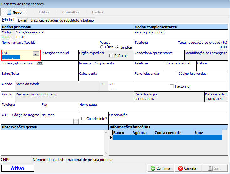 Para fazer a verificação, entre no cadastro do destinatário, Cadastro do Cliente (REC000CA) e Cadastro do Fornecedor (PAG000CA), verifique o campo “CNPJ”, como nas imagens abaixo:
