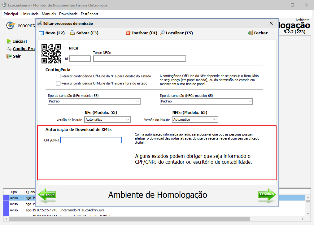 E verifique qual o CNPJ informado nas Configurações do Processo de Emissão (F5), na quarta aba, como na imagem abaixo: