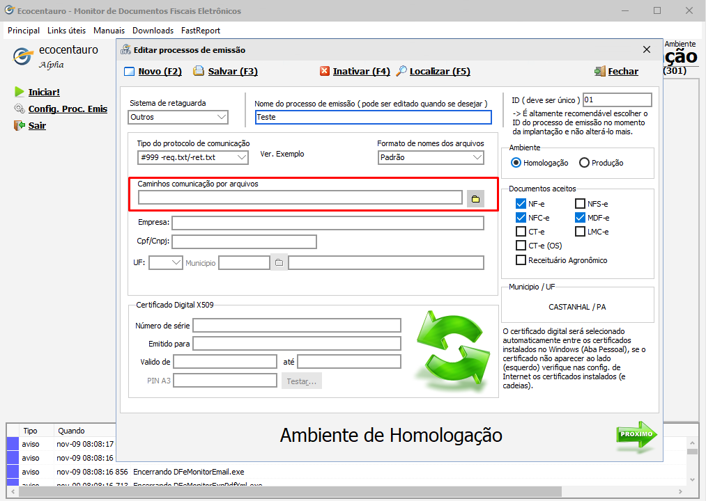 Os arquivos de requisições deverão ser criados dentro da pasta configurada no DFeMonitor, nas Configurações do Processo de Emissão (F5), como pode ser observado na imagem abaixo: