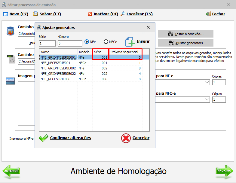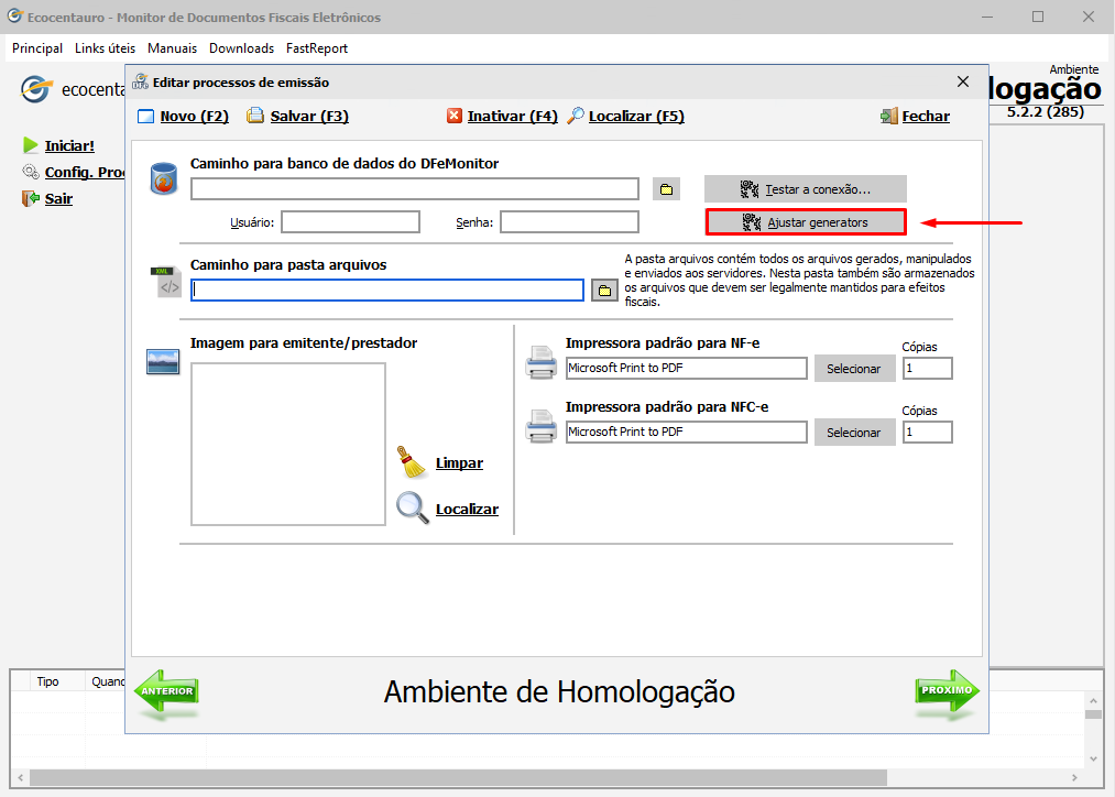 Feito isso, entre nas Configurações do Processo de Emissão (F5) do DFeMonitor, vá até a segunda aba, e clique em “Ajustar Generators” como na imagem abaixo: