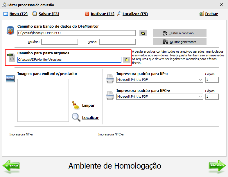 Você encontra o caminho da sua Pasta de Arquivos, nas Configurações do Processo de Emissão (F5) no DFeMonitor, na segunda aba, como na imagem a seguir: