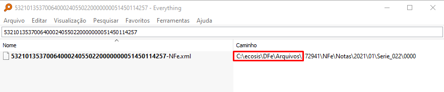 Agora copie a chave da nota, e cole no aplicativo Everything, que faz uma consulta dentro de todas as pastas do Disco Local C (Caso você não tenha o aplicativo, faça o download no link).
